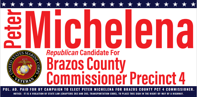 Committed to conservative principles, Peter Michelena stands for limited government, fiscal responsibility, and protecting individual liberties for the people of the Brazos Valley. A proven advocate for local business growth, public safety, and strong schools, Peter Michelena will prioritize lower taxes, transparent government, and policies that empower families and hardworking Texans. With deep ties to our community and a steady commonsense approach, Peter Michelena will fight to preserve our values and secure a prosperous future for the county.